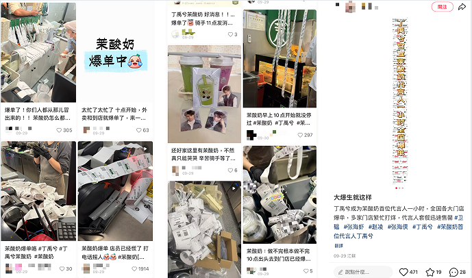代言效果立竿见影。官宣后一周,茉酸奶与丁禹兮登上微博“星品影响力”榜,拿下“TOP星品”与“新宣新品”双料第一,更登上“时趣洞察引擎”品牌社交影响力指数榜榜首。社交平台上,消费者自发晒出联名杯套、限定周边及代言人立牌打卡内容,部分粉丝为集齐周边多次下单,形成强大传播声势。