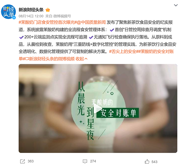 事实上,流量热度之外,茉酸奶的长期发展更依赖产品、供应链与用户体验的系统能力。作为牛油果酸奶奶昔开创者,茉酸奶将供应链延伸至秘鲁,与当地推广机构、顶级出口商合作建立当季原料直采模式,实现牛油果“身份溯源”;在透明化运营上,门店以透明橱窗展示原料、公开核心配比,大陆所有门店使用含B420菌种的有机牧场酸奶,今年8月更通过“茉酸奶的安全对账单”专题短片,披露“日管控周排查月调度”“200+云端监测点”等食安管控体系。